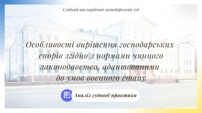 Східним апеляційним господарським судом здійснено аналіз судової практики щодо особливостей вирішення господарських спорів згідно з нормами чинного законодавства, адаптованими до умов воєнного стану.