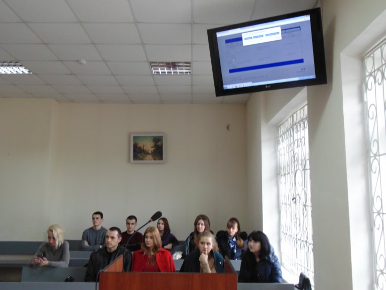 Алла Шевченко розповіла студентам про можливість проведення судових засідань у режимі відеоконференції та можливість відправки учасникам процесу процесуальних документів та судових повісток в електронному вигляді в рамках проекту «Електронний суд». Також звернула увагу студентів на можливість оплати судового збору в он-лайн режимі та можливість перегляду звіту про автоматизований розподіл справи. Наочно продемонструвала як розрахувати суму судового збору та сформувати відповідну квитанцію. А також Алла Шевченко показала як самостійно відстежити рух будь-якої справи на веб – сайті Зарічного районного суду м. Суми.