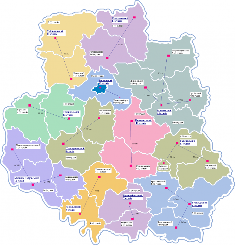 До відома голів судів доведено критерії визначення округів та матеріали щодо укрупнення мережі судів. За результатами обговорення питання щодо формування місцевих окружних судів Вінницької області спільно з головами судів сформовано пропозиції щодо реорганізації місцевих загальних судів та утворення місцевих окружних судів області, що надіслані до Державної судової адміністрації України.
